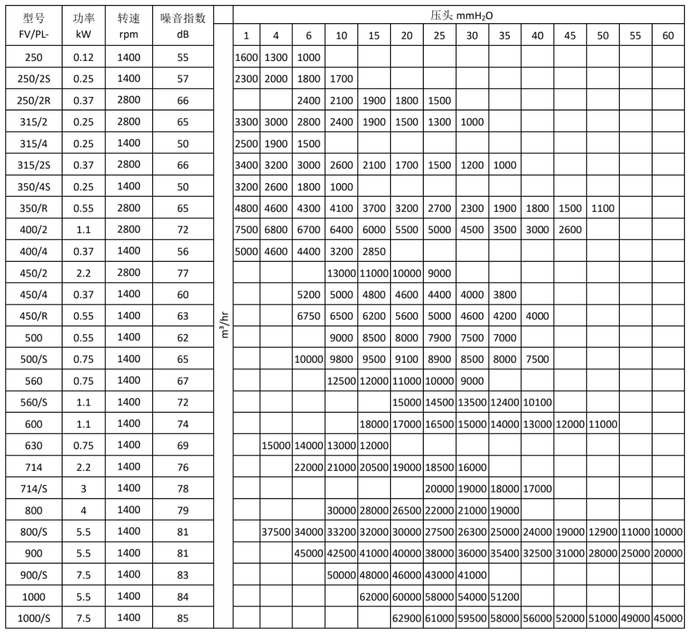 | 1000 | 50000-68000m³/hr | 80-800pa | 5-10kW | 轴流 |