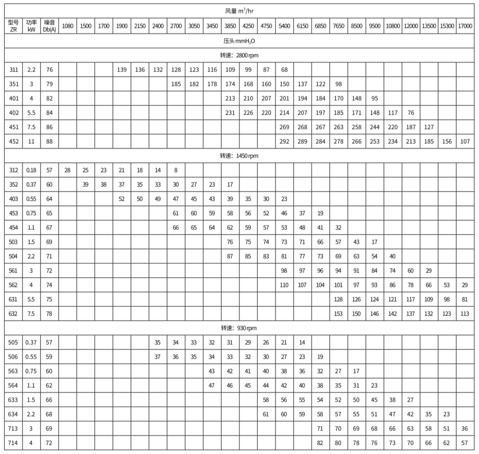 | 454 | 100-15000m³/hr | 80-800pa | 0.09-5kW | 离心 |