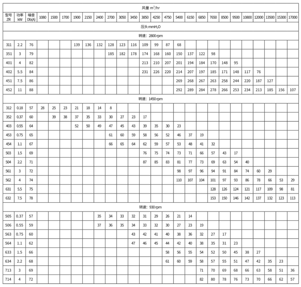 | 503 | 100-15000m³/hr | 80-800pa | 0.09-5kW | 离心 |