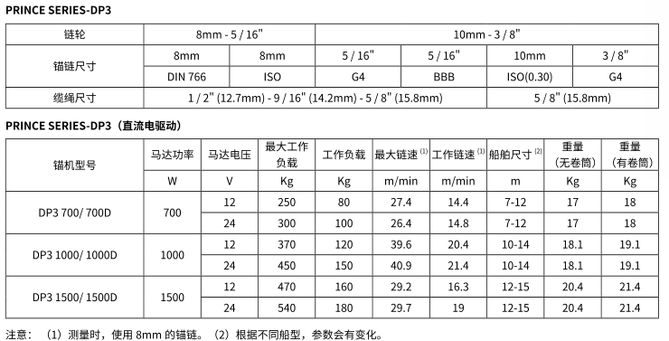 | 型号 | 马达功率 | 马达电压 | 工作负载 | 船舶尺寸 |